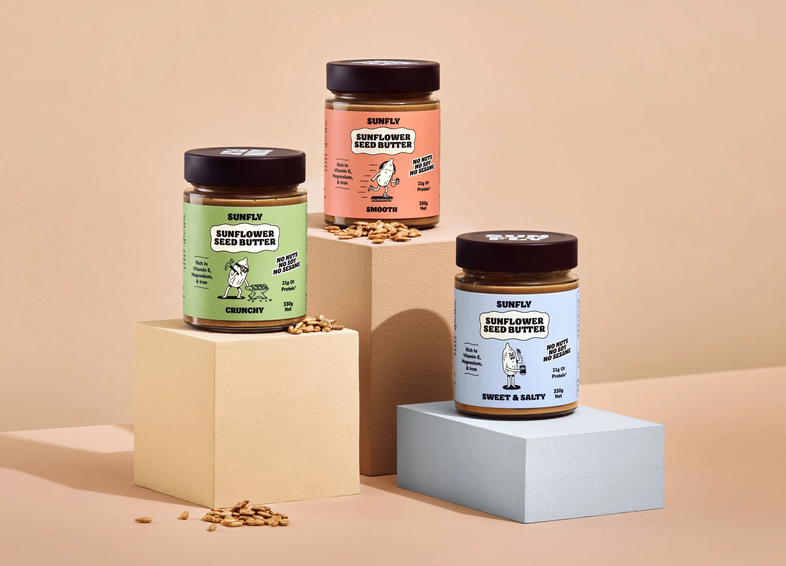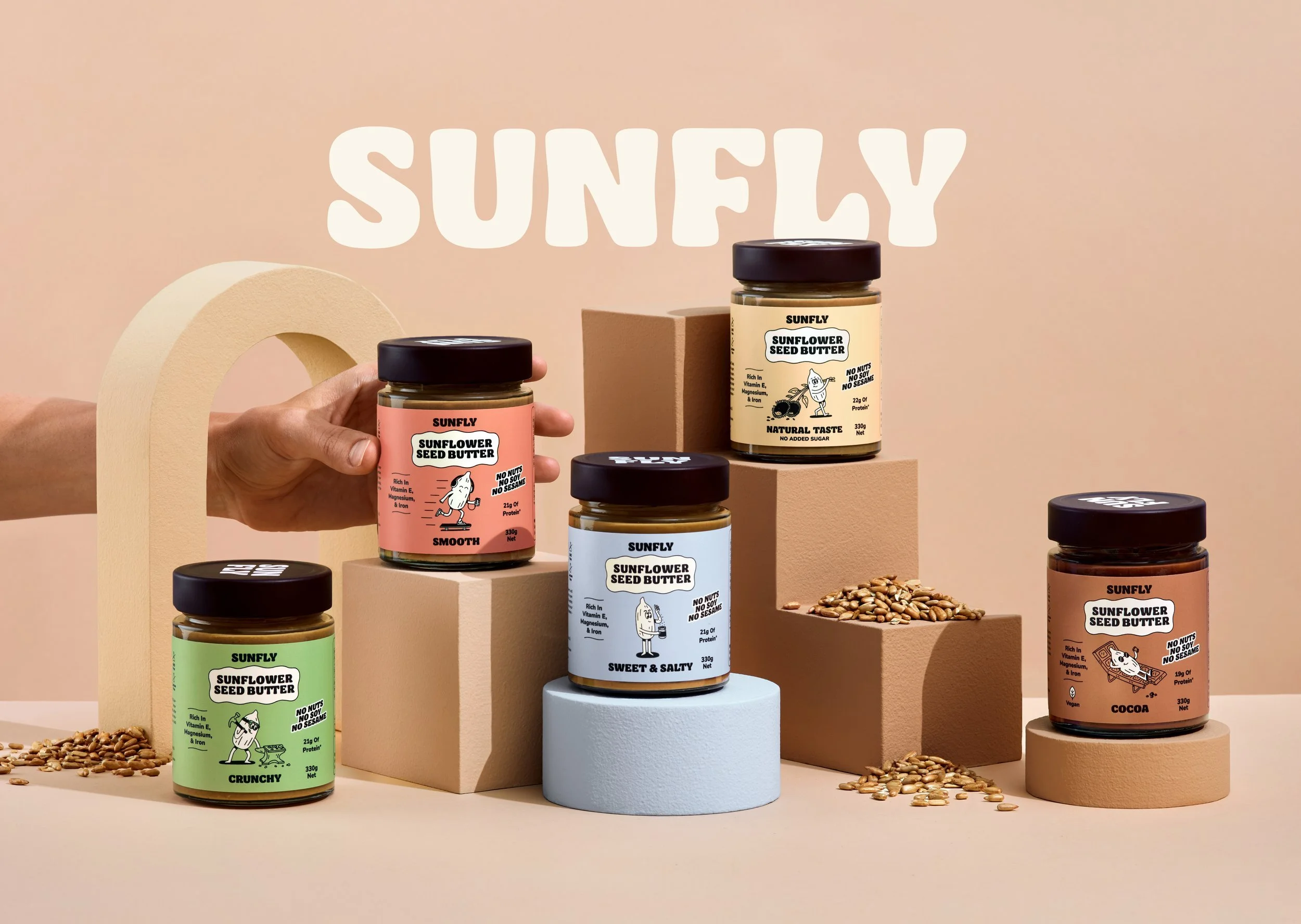 Sunfly set out to create the ultimate plant-based spreadable products using sunflower seeds. Turns out they’re not only top-allergen-free, but also packed with protein and nutrients. So I developed a distinct sunflower seed character, Kerny, and created playful illustrations, packaging design and social animations to bring the Sunfly brand to life in a fresh way.
